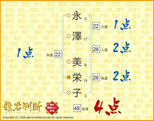 永(5画)澤(17画) 美(9画)栄(14画)子(3画)