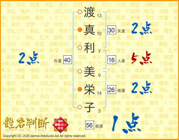 渡(13画)真(10画)利(7画) 美(9画)栄(14画)子(3画)