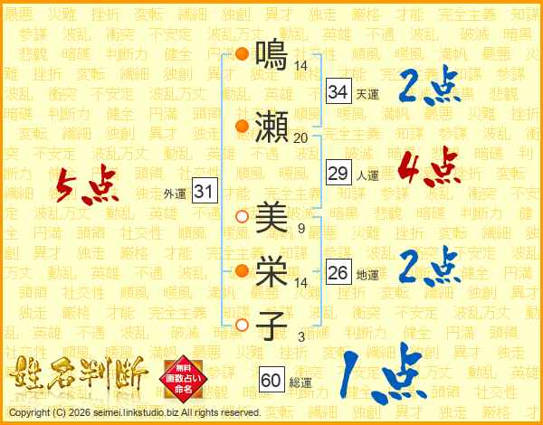 鳴(14画)瀬(20画) 美(9画)栄(14画)子(3画)