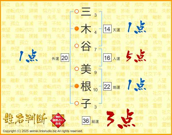 三(3画)木(4画)谷(7画) 美(9画)根(10画)子(3画)