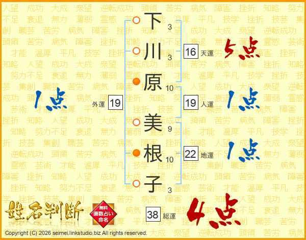 下(3画)川(3画)原(10画) 美(9画)根(10画)子(3画)