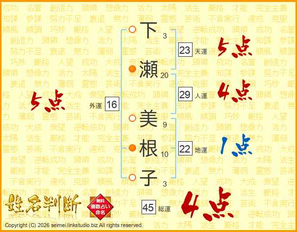 下(3画)瀬(20画) 美(9画)根(10画)子(3画)