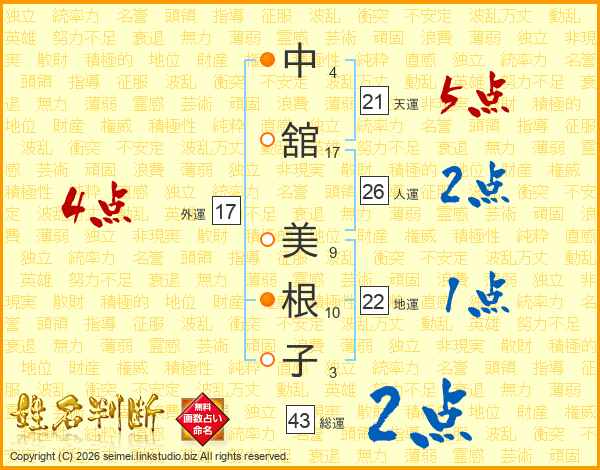 中(4画)舘(17画) 美(9画)根(10画)子(3画)