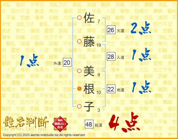 佐(7画)藤(19画) 美(9画)根(10画)子(3画)