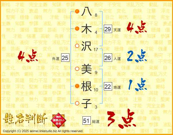 八(8画)木(4画)沢(17画) 美(9画)根(10画)子(3画)