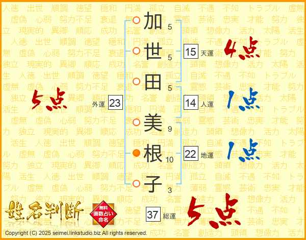 加世田美根子さんの総運は37画の5点!