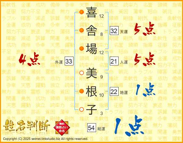 喜(12画)舎(8画)場(12画) 美(9画)根(10画)子(3画)