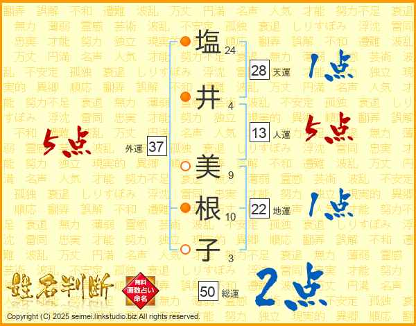 塩(24画)井(4画) 美(9画)根(10画)子(3画)