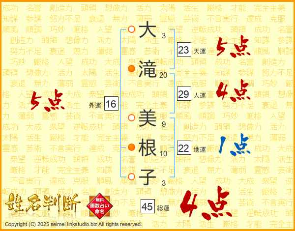 大(3画)滝(20画) 美(9画)根(10画)子(3画)