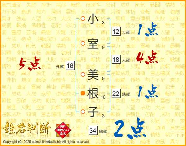 小(3画)室(9画) 美(9画)根(10画)子(3画)