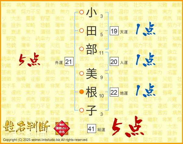 小(3画)田(5画)部(11画) 美(9画)根(10画)子(3画)