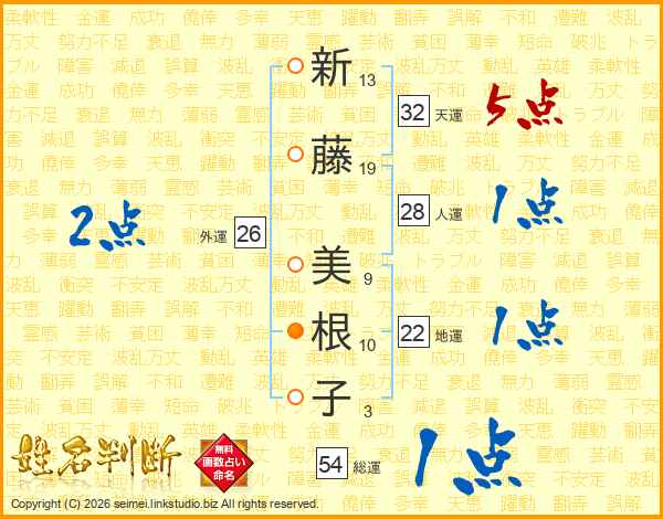 新(13画)藤(19画) 美(9画)根(10画)子(3画)