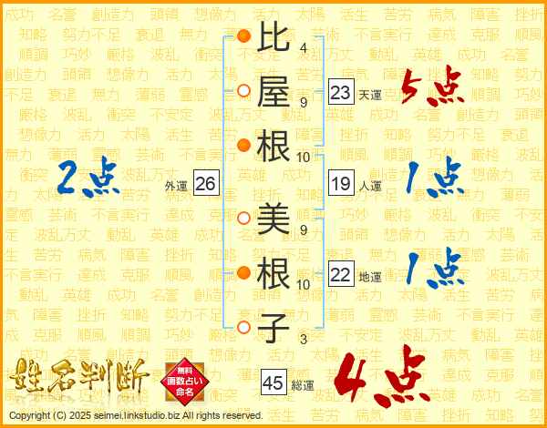 比(4画)屋(9画)根(10画) 美(9画)根(10画)子(3画)