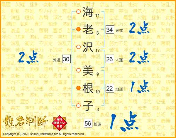 海(11画)老(6画)沢(17画) 美(9画)根(10画)子(3画)