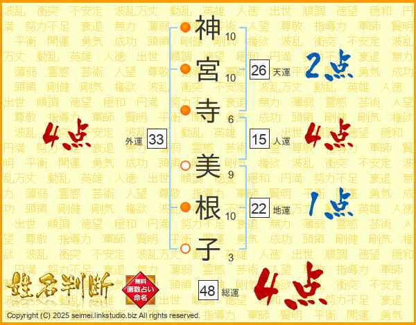 神(10画)宮(10画)寺(6画) 美(9画)根(10画)子(3画)