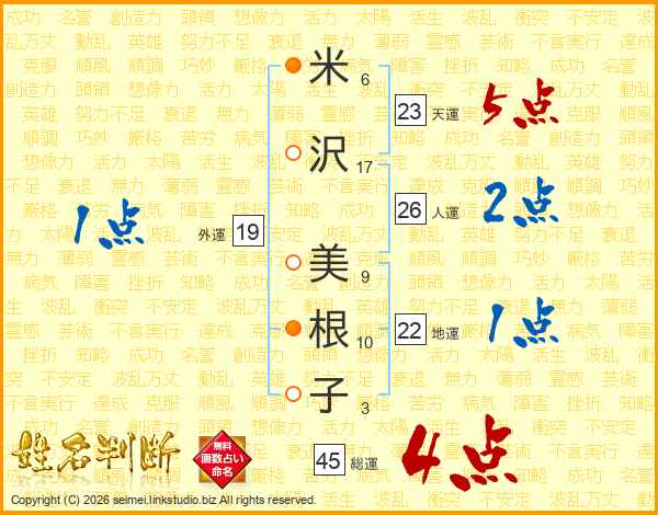 米(6画)沢(17画) 美(9画)根(10画)子(3画)