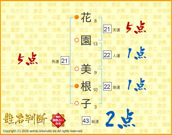 花(8画)園(13画) 美(9画)根(10画)子(3画)