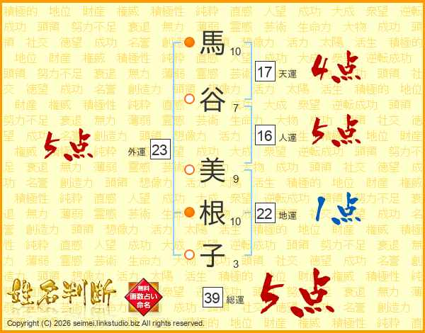 馬(10画)谷(7画) 美(9画)根(10画)子(3画)