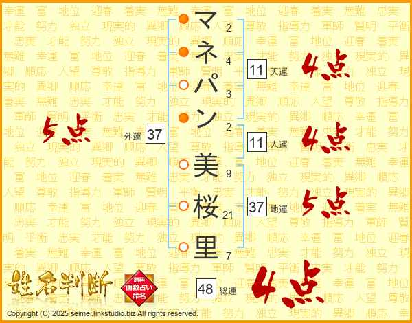 マ(2画)ネ(4画)パ(3画)ン(2画) 美(9画)桜(21画)里(7画)