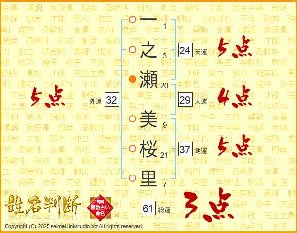 一(1画)之(3画)瀬(20画) 美(9画)桜(21画)里(7画)