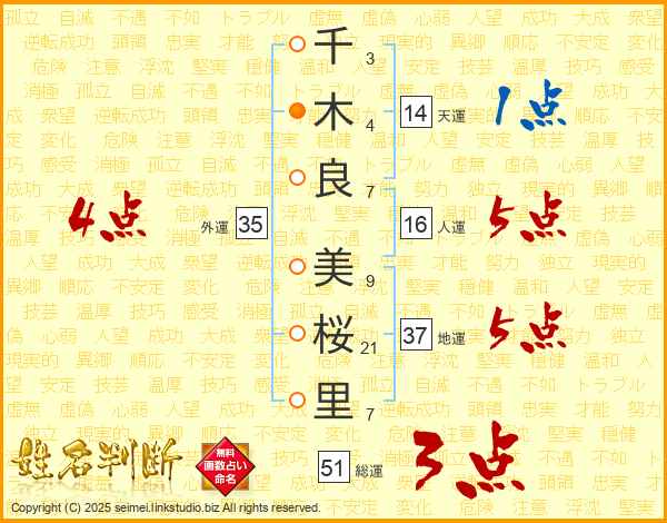 千(3画)木(4画)良(7画) 美(9画)桜(21画)里(7画)