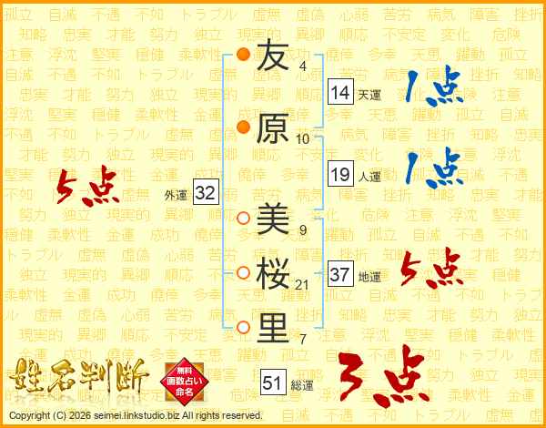 友(4画)原(10画) 美(9画)桜(21画)里(7画)