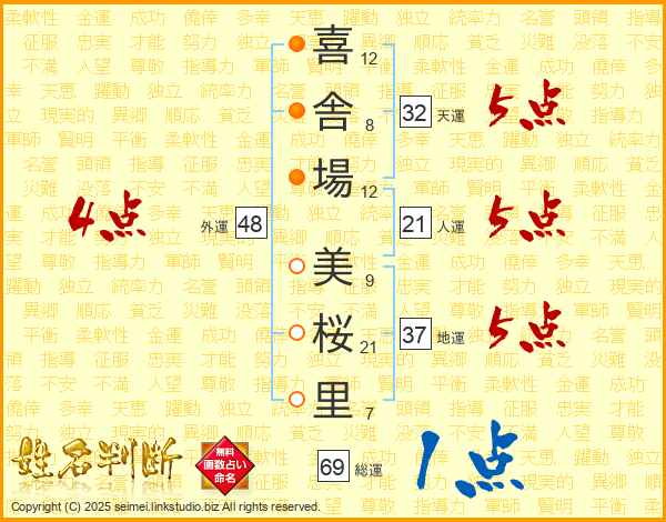 喜(12画)舎(8画)場(12画) 美(9画)桜(21画)里(7画)