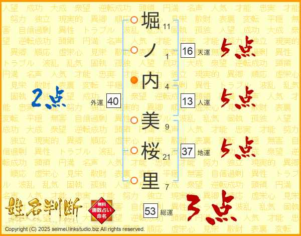 堀(11画)ノ(1画)内(4画) 美(9画)桜(21画)里(7画)