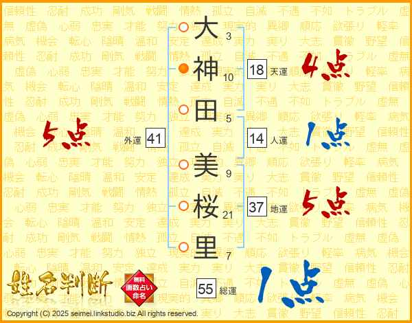 大(3画)神(10画)田(5画) 美(9画)桜(21画)里(7画)