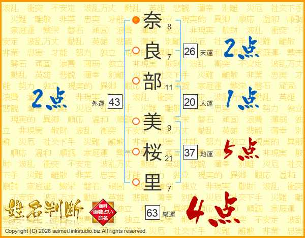 奈(8画)良(7画)部(11画) 美(9画)桜(21画)里(7画)