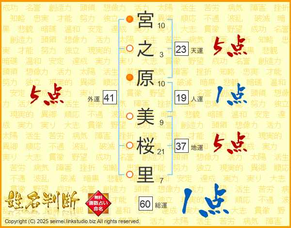 宮(10画)之(3画)原(10画) 美(9画)桜(21画)里(7画)