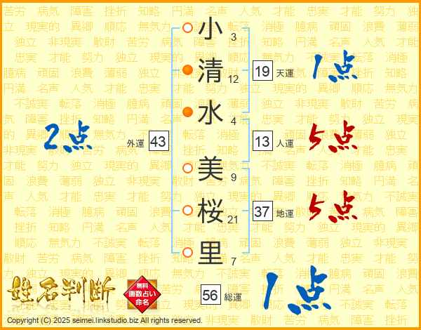 小(3画)清(12画)水(4画) 美(9画)桜(21画)里(7画)