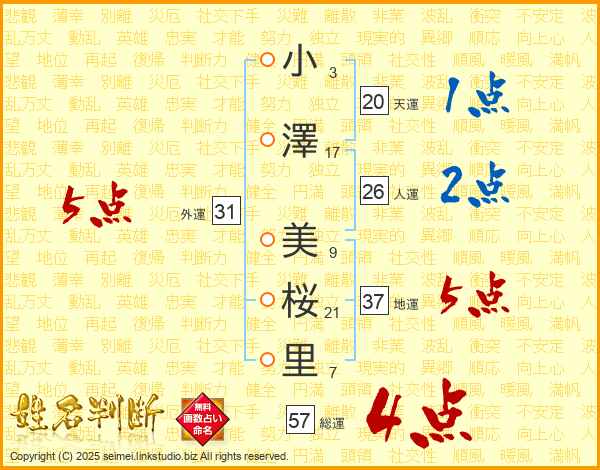 小(3画)澤(17画) 美(9画)桜(21画)里(7画)