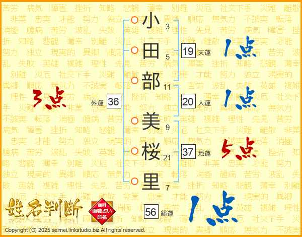 小(3画)田(5画)部(11画) 美(9画)桜(21画)里(7画)