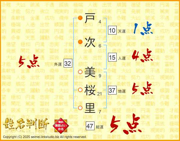 戸(4画)次(6画) 美(9画)桜(21画)里(7画)
