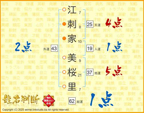 江(7画)刺(8画)家(10画) 美(9画)桜(21画)里(7画)
