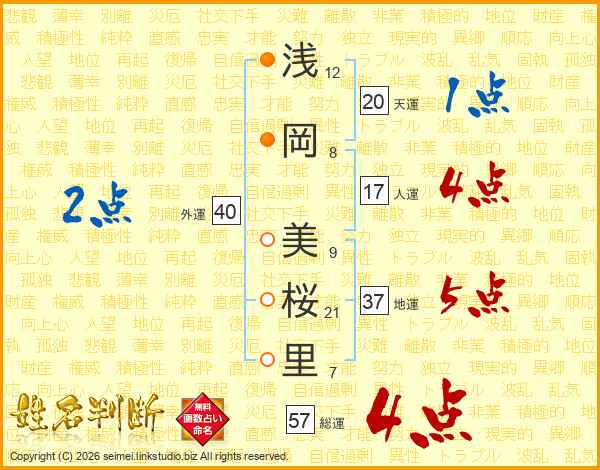 浅(12画)岡(8画) 美(9画)桜(21画)里(7画)