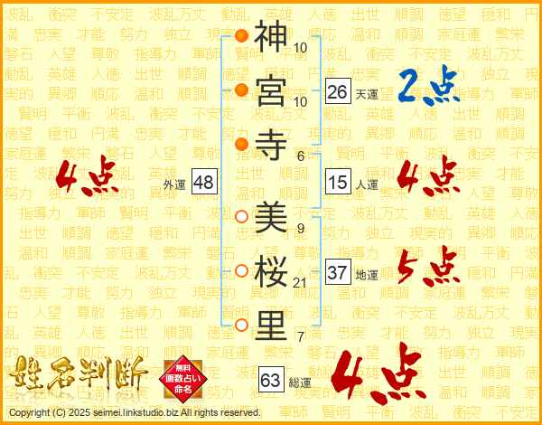 神(10画)宮(10画)寺(6画) 美(9画)桜(21画)里(7画)