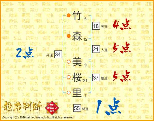竹(6画)森(12画) 美(9画)桜(21画)里(7画)
