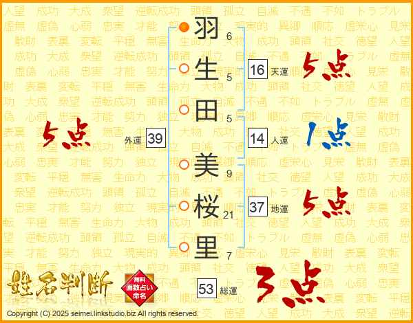羽(6画)生(5画)田(5画) 美(9画)桜(21画)里(7画)