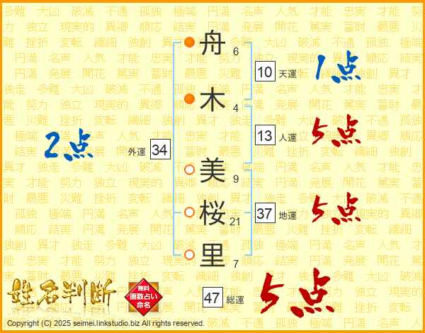 舟(6画)木(4画) 美(9画)桜(21画)里(7画)