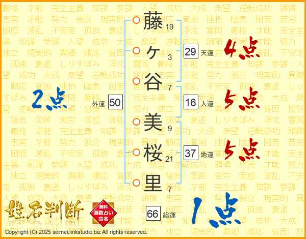 藤(19画)ヶ(3画)谷(7画) 美(9画)桜(21画)里(7画)
