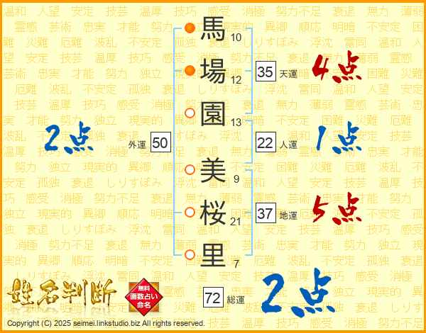 馬(10画)場(12画)園(13画) 美(9画)桜(21画)里(7画)