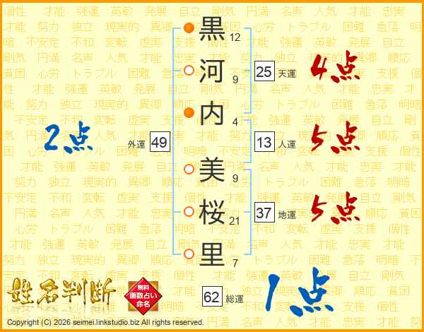 黒(12画)河(9画)内(4画) 美(9画)桜(21画)里(7画)