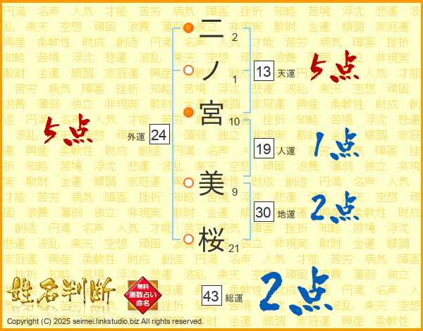二ノ宮美桜さんの総運は43画の2点!