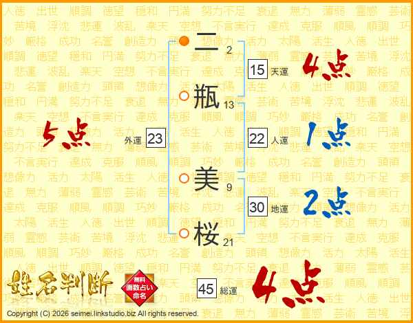 二(2画)瓶(13画) 美(9画)桜(21画)