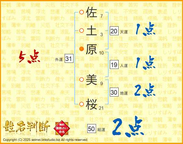 佐(7画)土(3画)原(10画) 美(9画)桜(21画)