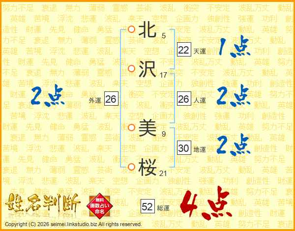 生活面を象徴する運勢です。外部から受ける影響力を表し、結婚運、家庭運や職場、環境への順応性を表します。総運から人運を引いた画数。姓や名が1文字の場合を除く。