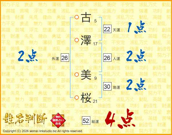 古(5画)澤(17画) 美(9画)桜(21画)