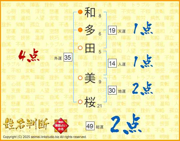 和(8画)多(6画)田(5画) 美(9画)桜(21画)